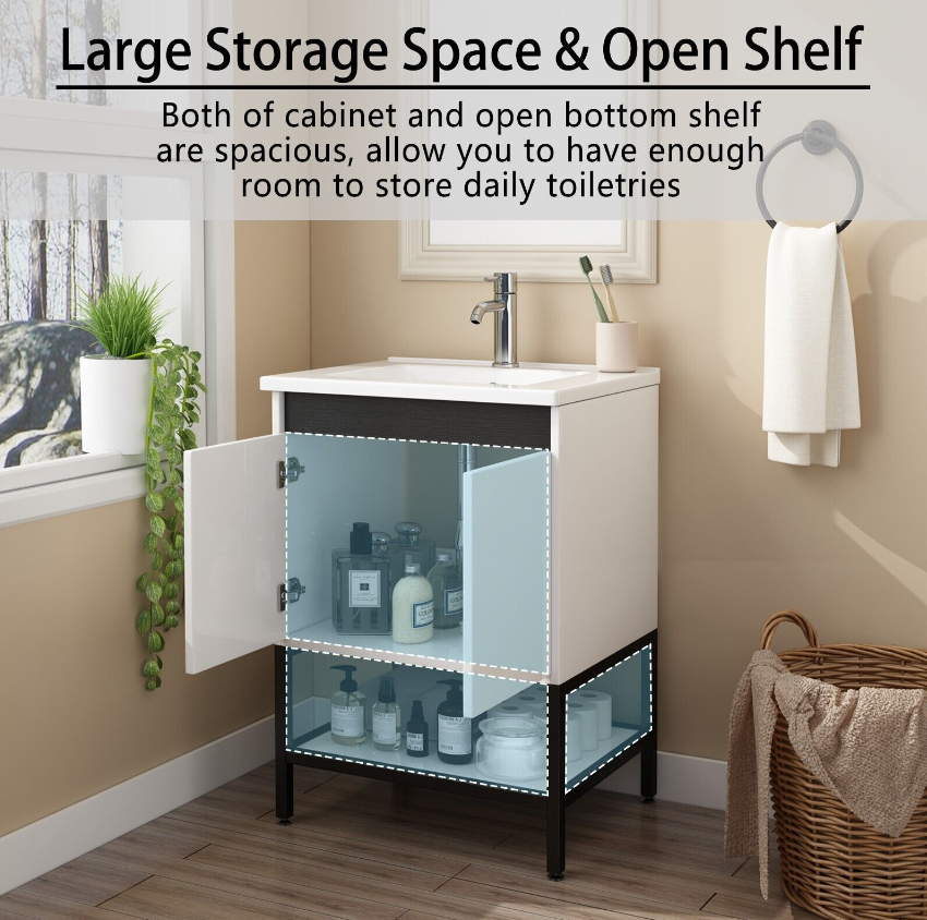 【Ample Storage Space】: This simple and practical design freestanding bathroom vanity features a cabinet and an open style shelf for storing bathroom essentials. Both the cabinet and the open bottom shelf are spacious, and both offer enough space to most necessities used in bathroom,You can store essential toiletries and bath items and you can put the towel on the open shelf that is easy to take.