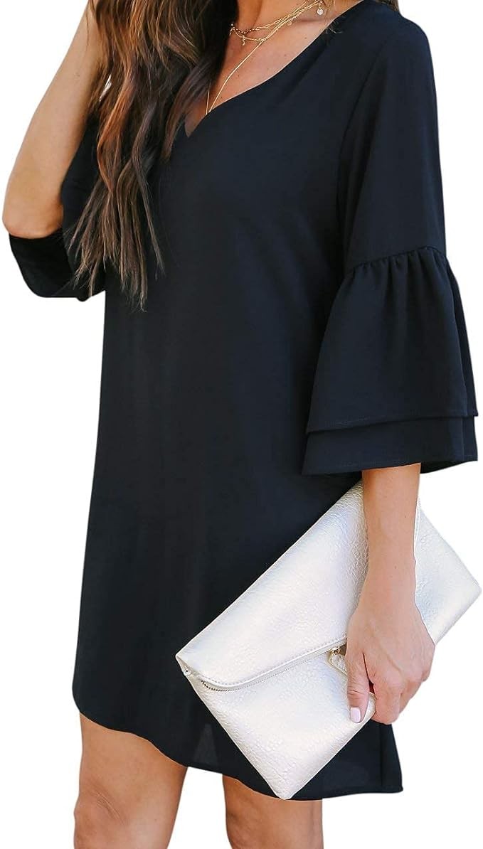 Features: short dress, V-neck, bell sleeve, soft lining, zipper in the back. Can dress it up or down. Flattering dress, shift dress, new fashion summer dress for women 2023, sweet & cute, soft and attractive. Perfect for a wedding or graduation.