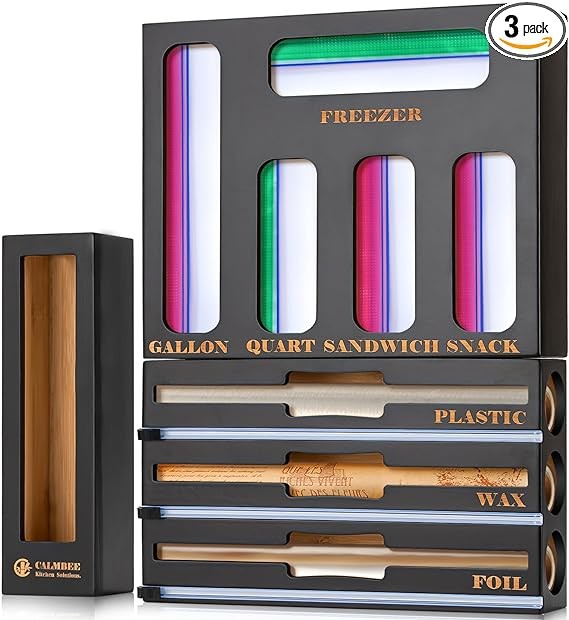Calmbee Storage Bag Organizer, Foil and plastic wrap organizer with cutter, Kitchen Organizers and Storage Compatible with Gallon, Quart, Sandwich, Snack Bags and 12" Aluminum Foil & Wax Paper,Black