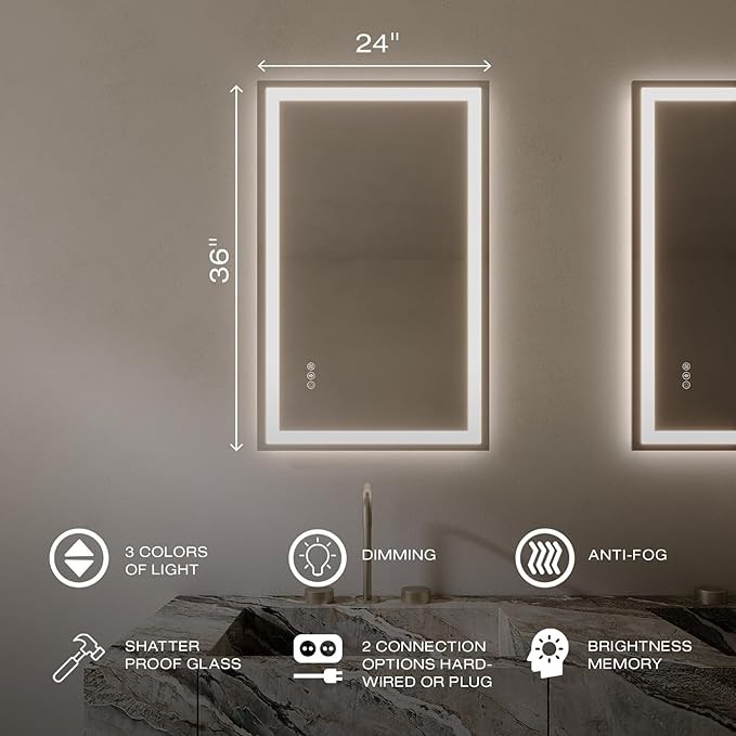 [Versatile Placement] With dimensions of 24x36 inches, this LED mirror for bathroom is the perfect size to enhance any walland its versatile design of mirror vanity allows you to place it vertically or horizontally with Tempered Glass, Anti-Fog & Smart Touch Button