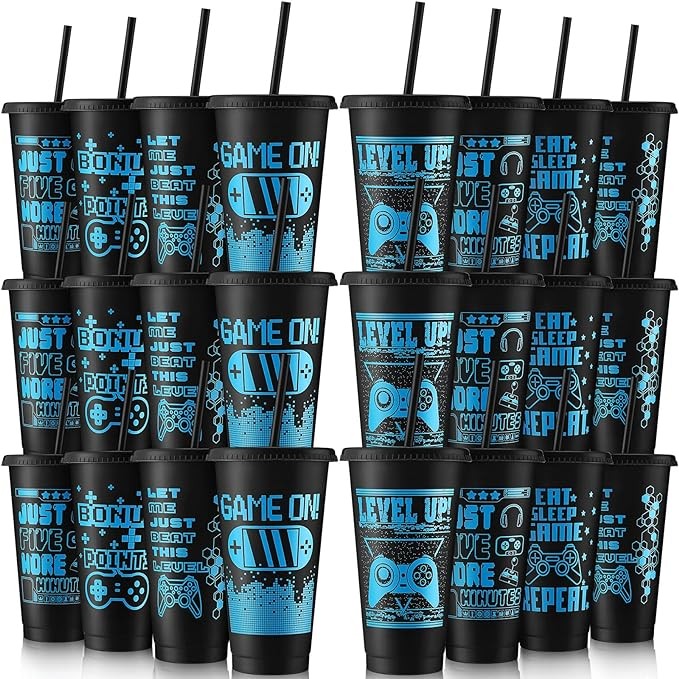 • Video Game Elements: these plastic iced coffee cups are designed with various gaming elements, such as game controllers and texts, which can add focus to your gamer themed events, ideal for boys and gaming lovers birthday parties