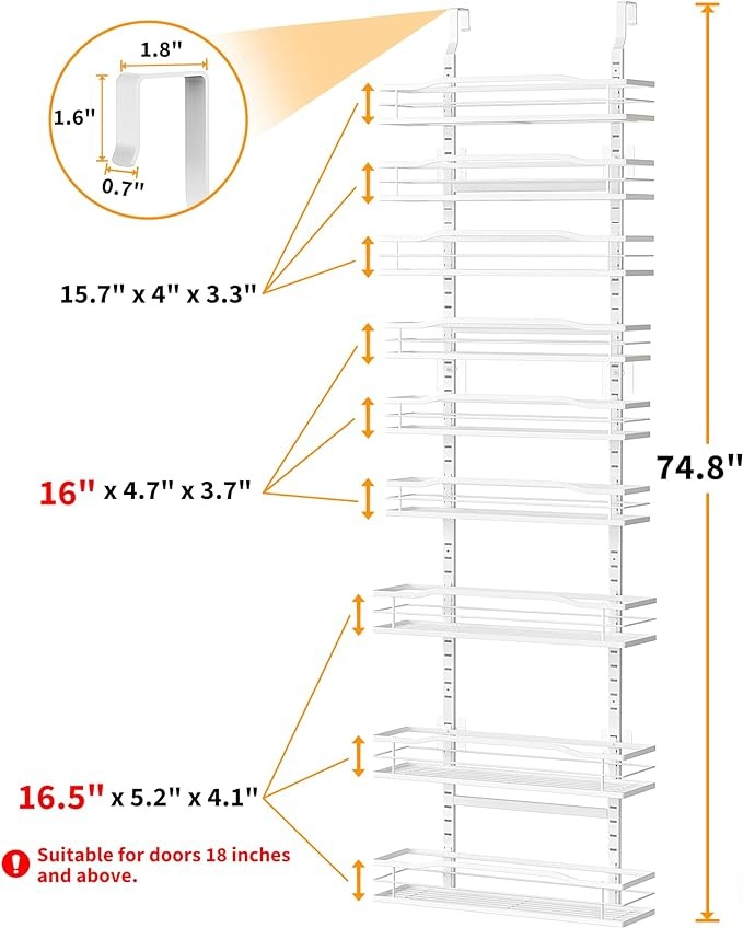 • Quick & Easy Installation: No tools or drilling are required to install our pantry organizer over any standard door. This makes it a hassle-free storage solution that won't damage your walls or doors.