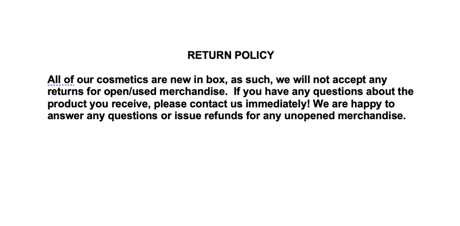 All our beauty products are new in box, as such, we will not accept any returns for OPEN/USED/TESTED merchandise.  If you have any questions about color matching or shades, please contact us before you buy!  We are happy to answer any questions or issue refunds for unopened/untested merchandise.