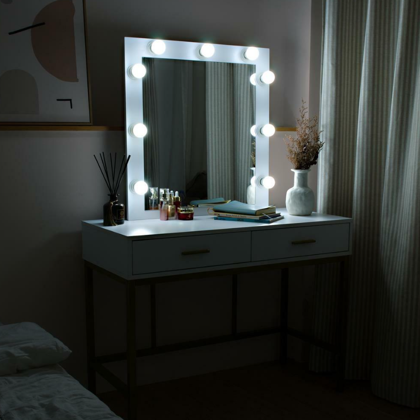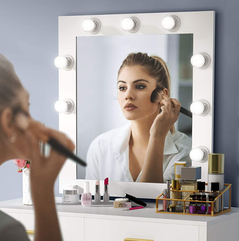 STYLISH YET FUNCTIONAL: This elegant lighted vanity table with mirror and 9 Hollywood style LED Light Bulbs will glamorize your bedroom or changing area that you've always dreamed of owning. Get the full picture in the large mirror with soft and non-dazzling light to prep for the coming day or primp for a night out.