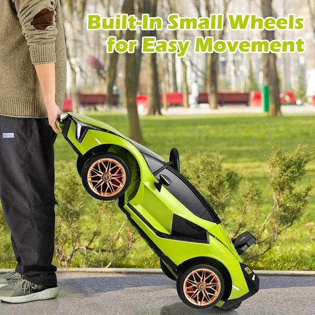 • ?PERFECT DESIGN: Lambo doors meet the imagination of children. Using simulation pneumatic levers, the doors open more smoothly. The doors turn up, allowing the kids to get on and off more gracefully. Real LED lights bring a more real driving experience to your baby. The rear of the kids’ car has hidden small wheels, which make it easy to move and carry the car.