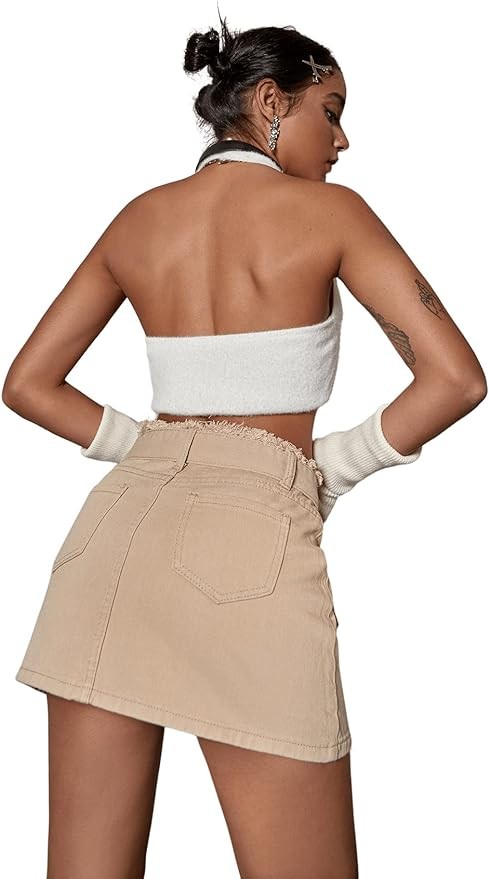 • Feature: High waist, zipper and button closure, buckle belt, frayed hem, casual denim mini skirt