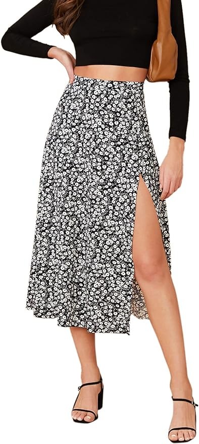 Verdusa Women's Sexy Boho Floral Split Thigh High Waist Swing Midi Skirt