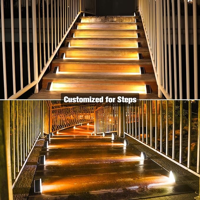 • 【Stylish and Functional】Solar step light can create a bright beam of light on each step, allowing every inch of the stairs to be clearly visible and reducing the risk of accidents or falls. Additionally, these step light outdoor can enhance the aesthetic appeal of the patio step, improving the overall appearance of outdoor steps. Don't settle for ordinary outdoor step lighting – upgrade to super lighting solar stair lights and enjoy the perfect combination of style and functionality.